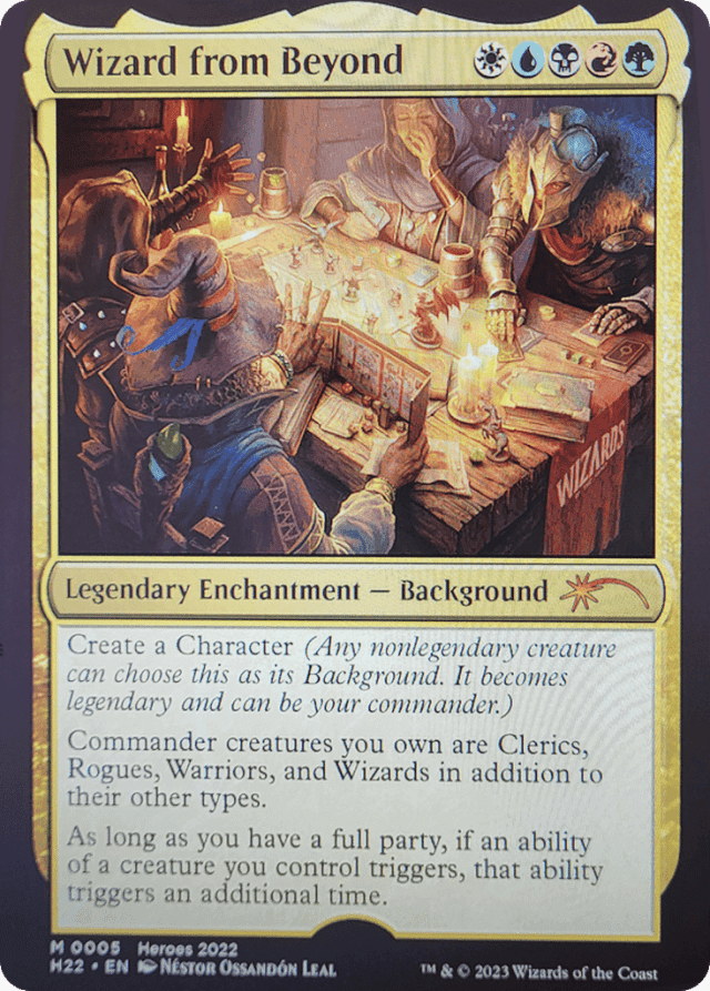 Create a Character (Any nonlegendary creature can choose this as its Background. It becomes legendary and can be your commander.) Commander creatures you own are Clerics, Rogues, Warriors, and Wizards in addition to their other types. As long as you have a full party, if an ability of a creature you control triggers, that ability triggers an additional time.