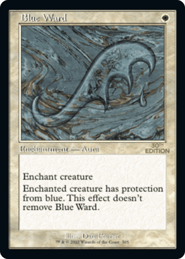 Enchant creature Enchanted creature has protection from blue. This effect doesn't remove this Aura.
