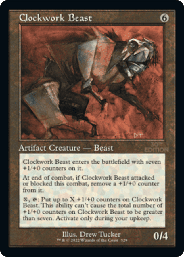 Can attack or block even if it has no counters. — Loses a counter even if it is affected by a Fog-like effect which prevents it from dealing damage. — Clockwork Beast’s last ability resolves, you can choose to put fewer than X +1/+0 counters on it. — If Clockwork Beast has seven or fewer +1/+0 counters on it when its last ability resolves, it can wind up a maximum of seven such counters on it. If it has seven or more +1/+0 counters on it, the ability will have no effect. — This is a change from the most recent wording. Now, if some other spell or ability causes +1/+0 counters to be put on Clockwork Beast, it can wind up with more than seven such counters on it.