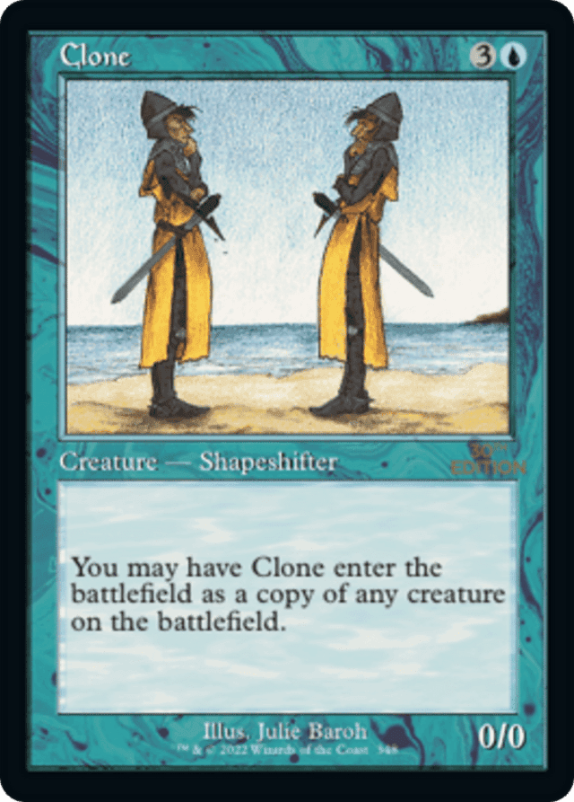 Any "enters" abilities of the copied creature will trigger when Clone enters the battlefield. Any "as [this creature] enters" or "[this creature] enters with" abilities of the chosen creature will also work. — If the chosen creature is a token, Clone copies the original characteristics of that token as stated by the effect that put it onto the battlefield. Clone is not a token. — If the chosen creature is copying something else (for example, if the chosen creature is another Clone), then your Clone enters as whatever the chosen creature copied. — If the chosen creature has {X} in its mana cost (such as Protean Hydra), X is considered to be zero. — Clone copies exactly what was printed on the original creature and nothing more (unless that creature is copying something else or is a token; see below). It doesn't copy whether that creature is tapped or untapped, whether it has any counters on it or Auras attached to it, or any non-copy effects that have changed its power, toughness, types, color, or so on. — If Clone somehow enters at the same time as another creature, Clone can't become a copy of that creature. You may choose only a creature that's already on the battlefield. — You can choose not to copy anything. In that case, Clone enters as a 0/0 Shapeshifter creature, and is probably put into the graveyard immediately. — Clone's ability doesn't target the chosen creature.