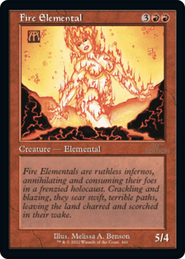 Fire Elementals are ruthless infernos, annihilating and consuming their foes in a frenzied holocaust. Crackling and blazing, they sear swift, terrible paths, leaving the land charred and scorched in their wake.
