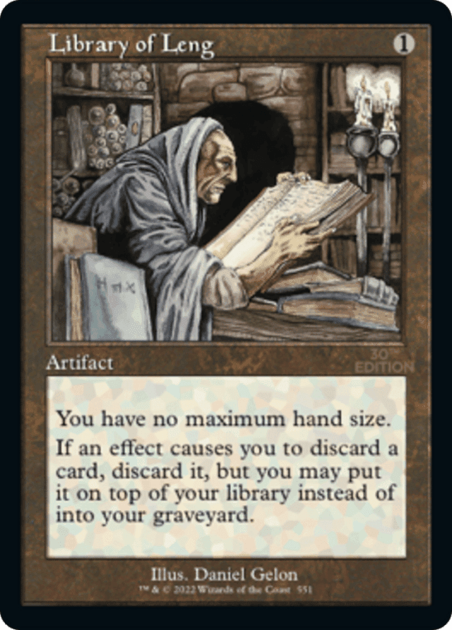 If more than one card is discarded due to a single effect, the Library allows you to decide whether or not to use it on each of the cards. You get to decide the order the cards are placed on the library if more than one goes there. — Since the card goes directly to the library, the card is not revealed unless the spell or ability requiring the discard specifically says it is. — The ability applies any time a spell or ability has you discard as part of its effect. It does not matter if you or your opponent control the spell or ability. The discard is forced because it is an effect. — The ability replaces the normal discard action with a discard action that puts the card on the library instead of the graveyard. — The discard triggers anything else that triggers on discards. — This effect has no effect on the cards being put into the graveyard from a library, because they are not "discarded". — You can look at a randomly discarded card before deciding where it goes. — You can't use the Library of Leng ability to place a discarded card on top of your library when you discard a card as a cost, because costs aren't effects. — If multiple effects modify your hand size, apply them in timestamp order. For example, if you put Null Profusion (an enchantment that says your maximum hand size is two) onto the battlefield and then put Library of Leng onto the battlefield, you'll have no maximum hand size. However, if those permanents entered in the opposite order, your maximum hand size would be two.