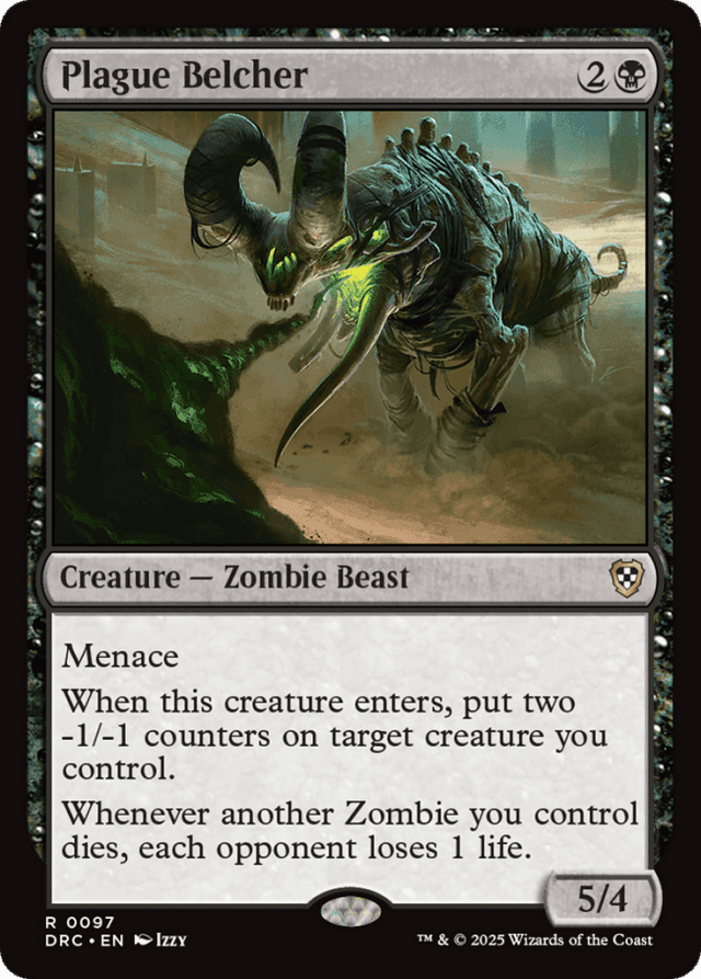 If another Zombie you control dies at the same time as Plague Belcher, Plague Belcher’s last ability will trigger for that Zombie. — In a Two-Headed Giant game, the triggered ability of Plague Belcher causes the opposing team to lose 2 life.