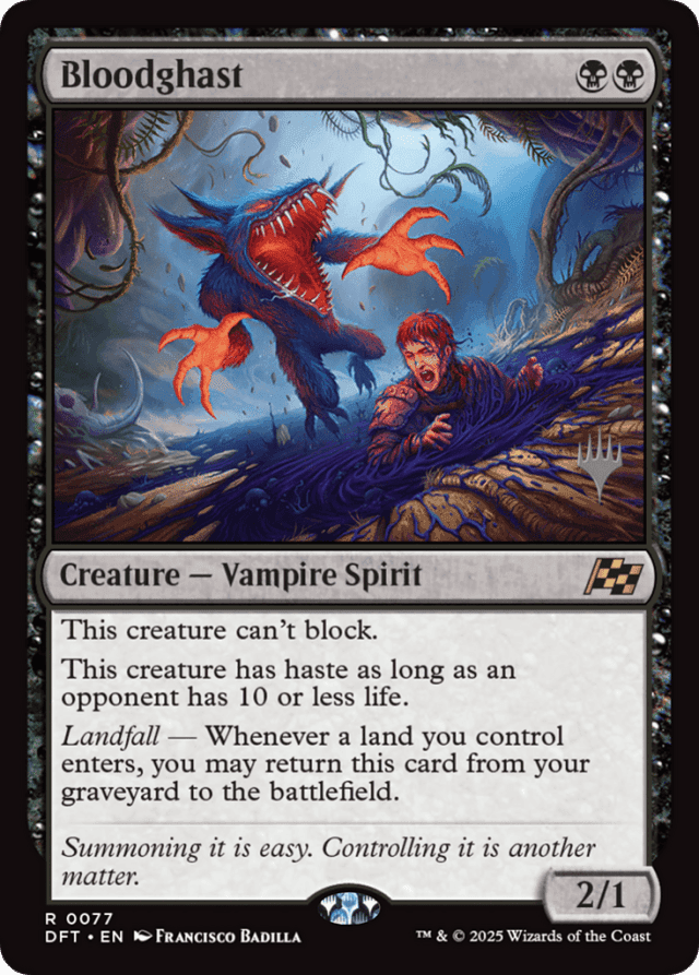 This creature can't block. This creature has haste as long as an opponent has 10 or less life. Landfall — Whenever a land you control enters, you may return this card from your graveyard to the battlefield.