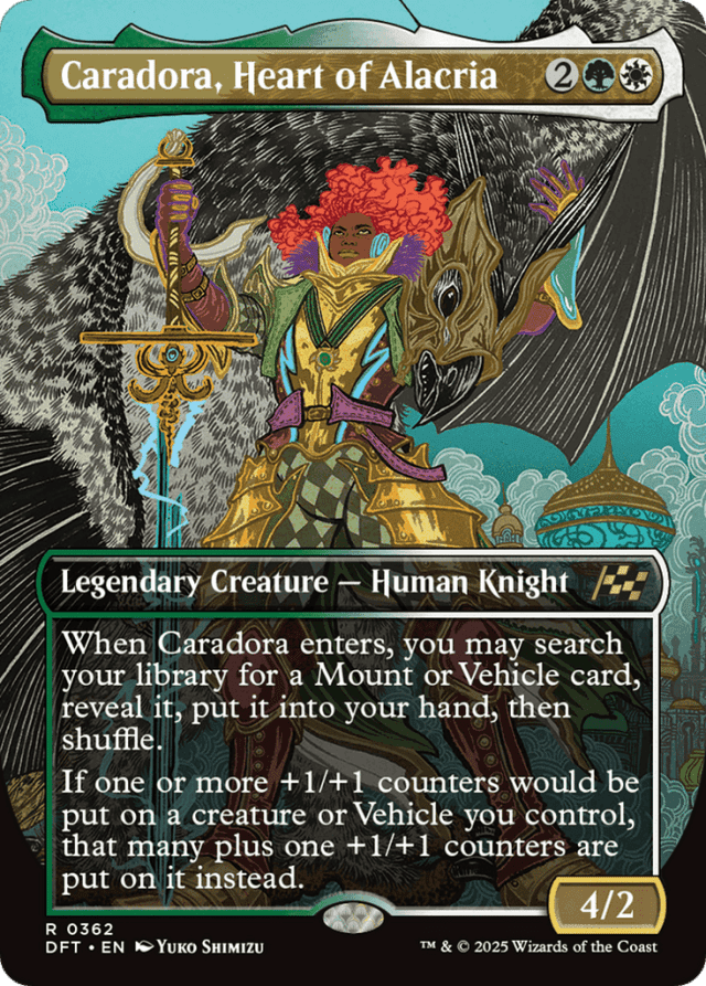 When Caradora enters, you may search your library for a Mount or Vehicle card, reveal it, put it into your hand, then shuffle. If one or more +1/+1 counters would be put on a creature or Vehicle you control, that many plus one +1/+1 counters are put on it instead.