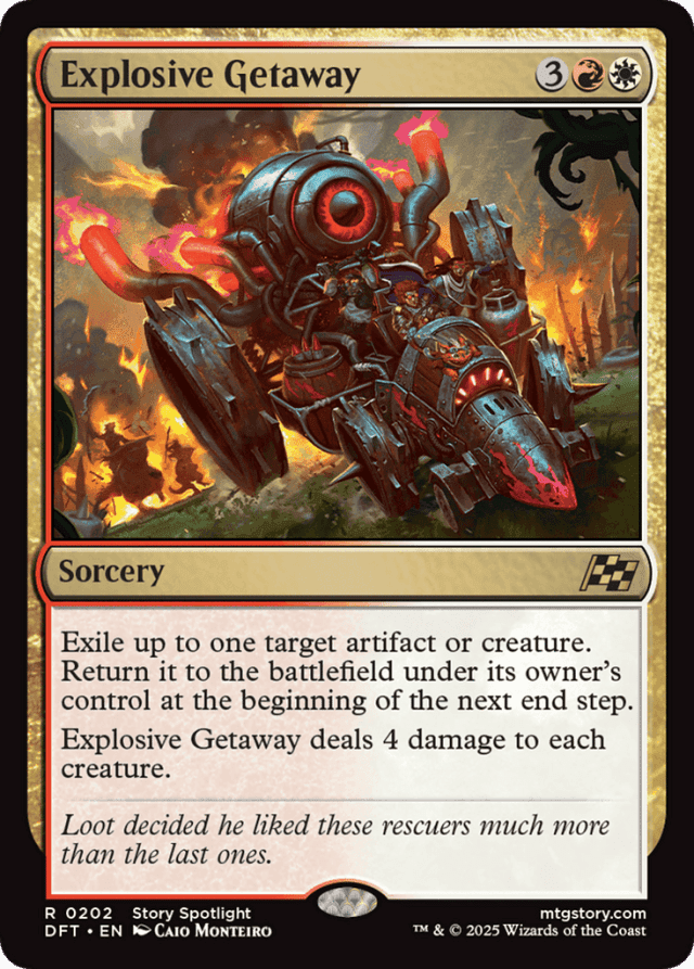 Exile up to one target artifact or creature. Return it to the battlefield under its owner's control at the beginning of the next end step. Explosive Getaway deals 4 damage to each creature.