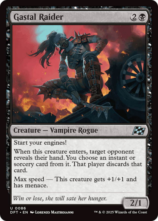 Start your engines! When this creature enters, target opponent reveals their hand. You choose an instant or sorcery card from it. That player discards that card. Max speed — This creature gets +1/+1 and has menace.