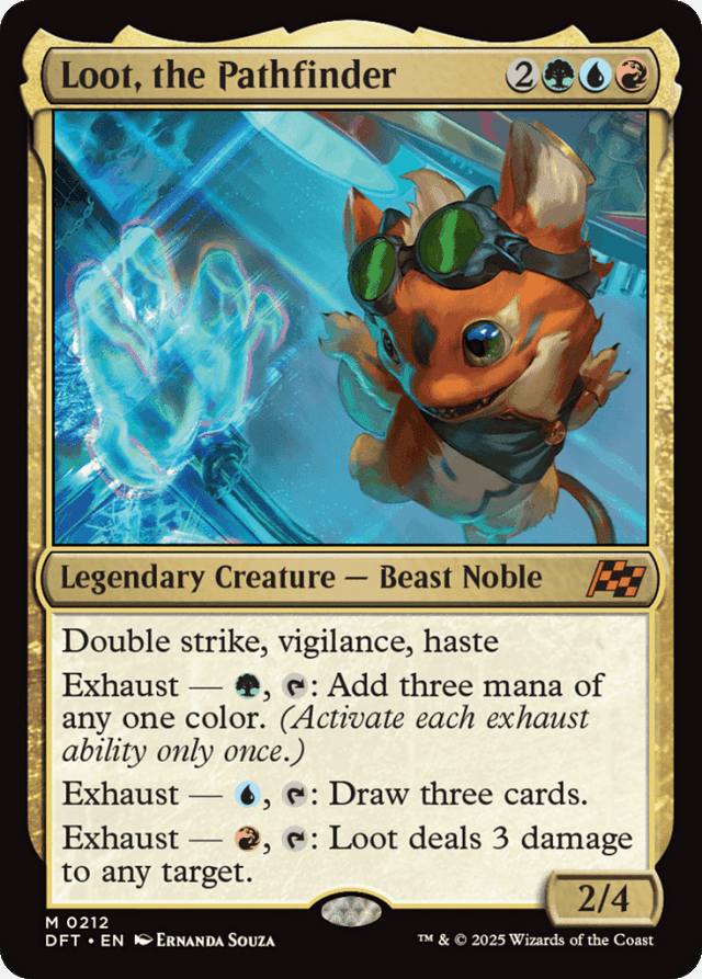 Double strike, vigilance, haste Exhaust — {G}, {T}: Add three mana of any one color. (Activate each exhaust ability only once.) Exhaust — {U}, {T}: Draw three cards. Exhaust — {R}, {T}: Loot deals 3 damage to any target.