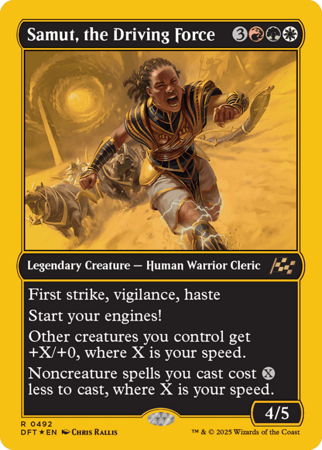 First strike, vigilance, haste Start your engines! (If you have no speed, it starts at 1. It increases once on each of your turns when an opponent loses life. Max speed is 4.) Other creatures you control get +X/+0, where X is your speed. Noncreature spells you cast cost {X} less to cast, where X is your speed.