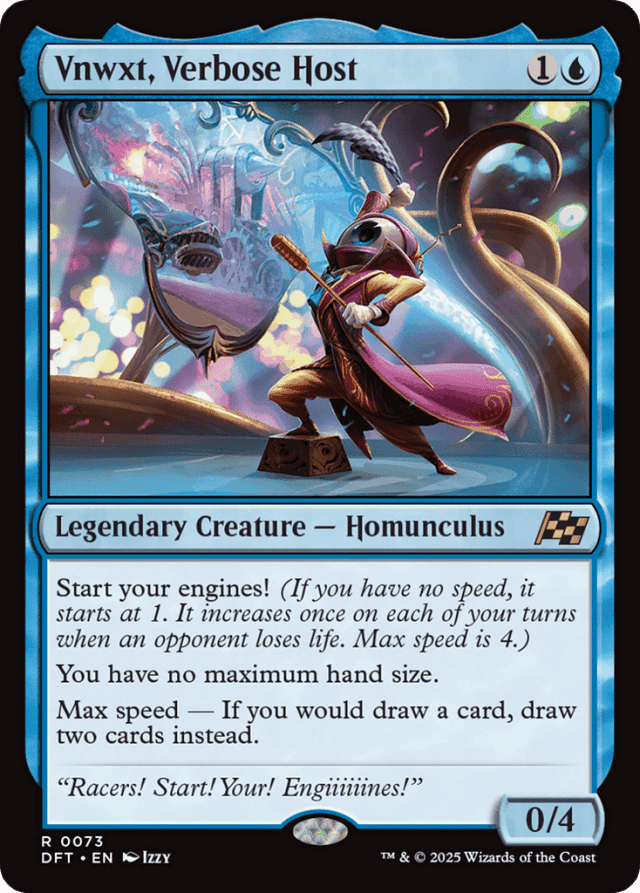 A player “has max speed” if their speed is 4. — Each player tracks their speed (or lack thereof) separately. Increasing your speed has no effect on whether another player has speed. — If a spell or ability causes you to draw multiple cards, this creature’s last ability doubles each card draw. For example, if you cast Harmonize (“Draw three cards”), you’ll draw six cards. — If an effect needs to know what a player’s speed is and that player doesn’t have a speed, their speed is considered 0. — If two or more replacement effects would apply to a card-drawing event, the player who’s drawing the card chooses what order to apply them. — Start your engines! isn’t a triggered ability. Increasing your speed to 1 is something that happens as a state-based action as soon as you control a permanent with the ability. Notably, this includes gaining control of a permanent with the ability that another player controls. — The effects of multiple such effects are cumulative. For example, if you have max speed and control both Vnwxt and Thought Reflection (an enchantment with the same ability), you’ll draw four times the original number of cards. — Your speed doesn’t change until a spell or ability says so, such as the inherent triggered ability that cares about opponents losing life during your turn. Notably, losing control of permanents with start your engines! doesn’t affect your speed. — “Max speed — [ability]” means “As long as you have max speed, this object has [ability].” If the granted ability functions in a zone other than the battlefield, the max speed ability does too.