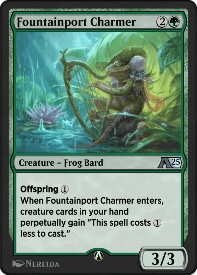 Offspring {1} When Fountainport Charmer enters, creature cards in your hand perpetually gain "This spell costs {1} less to cast."