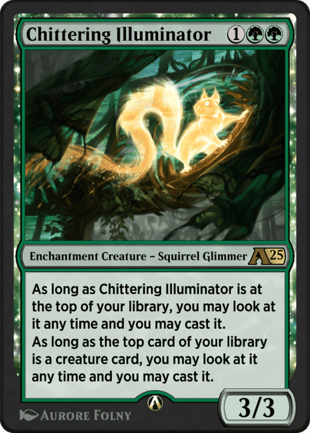 As long as Chittering Illuminator is at the top of your library, you may look at it any time and you may cast it. As long as the top card of your library is a creature card, you may look at it any time and you may cast it.