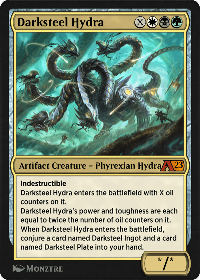 Indestructible Darksteel Hydra enters with X oil counters on it. Darksteel Hydra's power and toughness are each equal to twice the number of oil counters on it. When Darksteel Hydra enters, conjure a card named Darksteel Ingot and a card named Darksteel Plate into your hand.