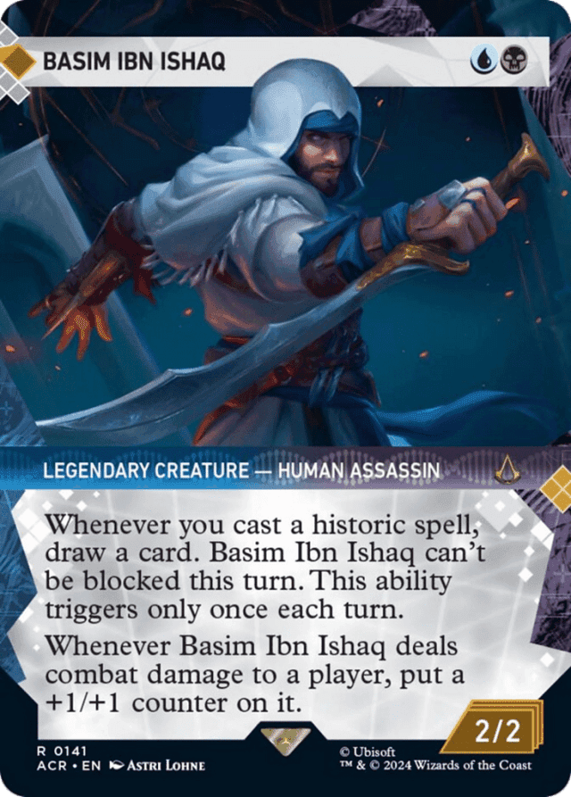 Whenever you cast a historic spell, draw a card. Basim Ibn Ishaq can't be blocked this turn. This ability triggers only once each turn. (Artifacts, legendaries, and Sagas are historic.) Whenever Basim Ibn Ishaq deals combat damage to a player, put a +1/+1 counter on it.