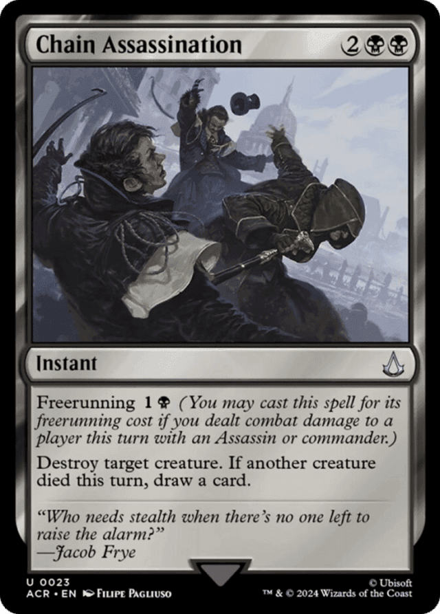 If the target creature is a legal target but isn’t destroyed, most likely because it has indestructible, you’ll still draw a card if another creature died this turn. — If the target creature is an illegal target by the time Chain Assassination tries to resolve, it won’t resolve and none of its effects will happen. You won’t draw a card even if another creature has died this turn. — Once an Assassin creature or commander you control deals combat damage to a player in a turn, you can cast spells for their freerunning costs for the rest of that turn. It doesn’t matter what happens to that Assassin or commander after that.