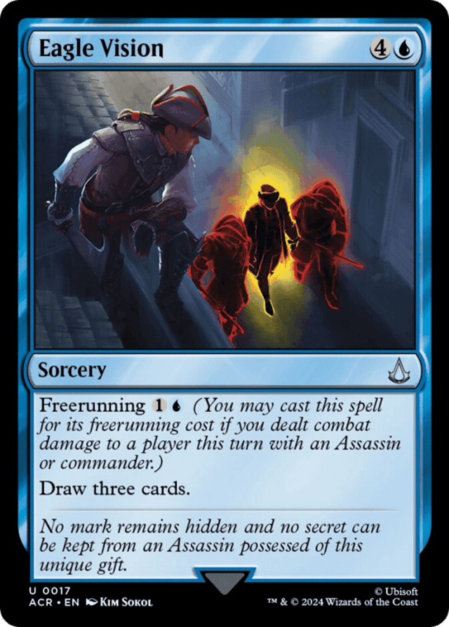 Freerunning {1}{U} (You may cast this spell for its freerunning cost if you dealt combat damage to a player this turn with an Assassin or commander.) Draw three cards.