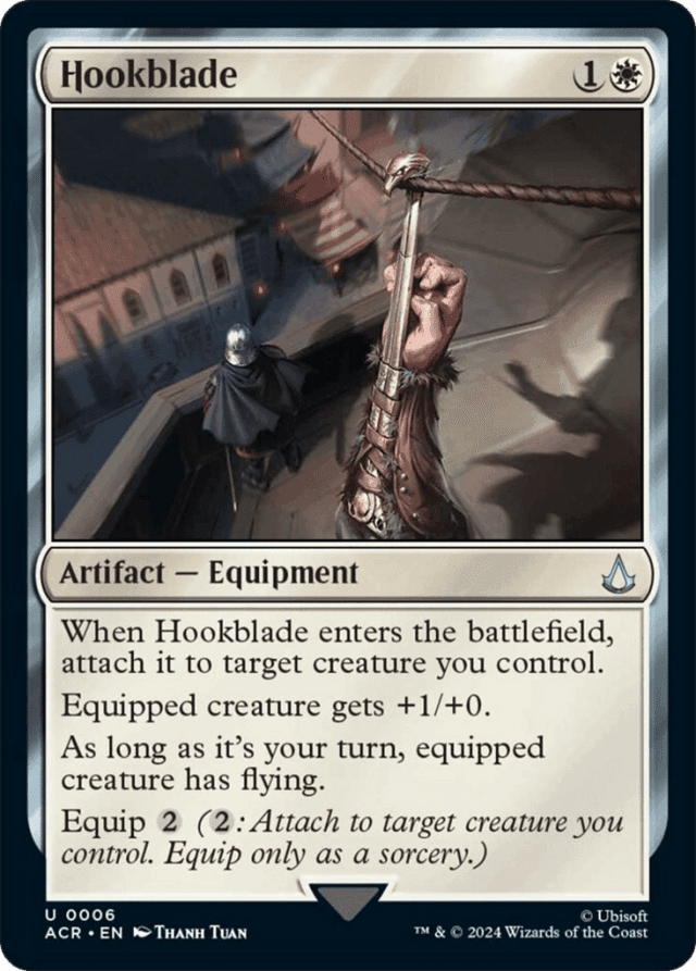 When this Equipment enters, attach it to target creature you control. Equipped creature gets +1/+0. During your turn, equipped creature has flying. Equip {2} ({2}: Attach to target creature you control. Equip only as a sorcery.)