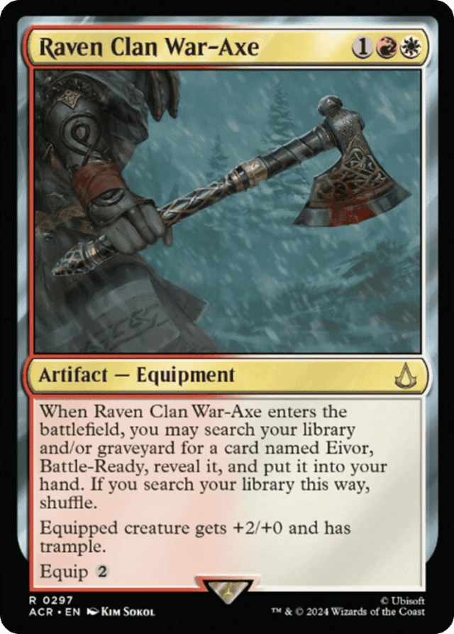 When this Equipment enters, you may search your library and/or graveyard for a card named Eivor, Battle-Ready, reveal it, and put it into your hand. If you search your library this way, shuffle. Equipped creature gets +2/+0 and has trample. Equip {2}