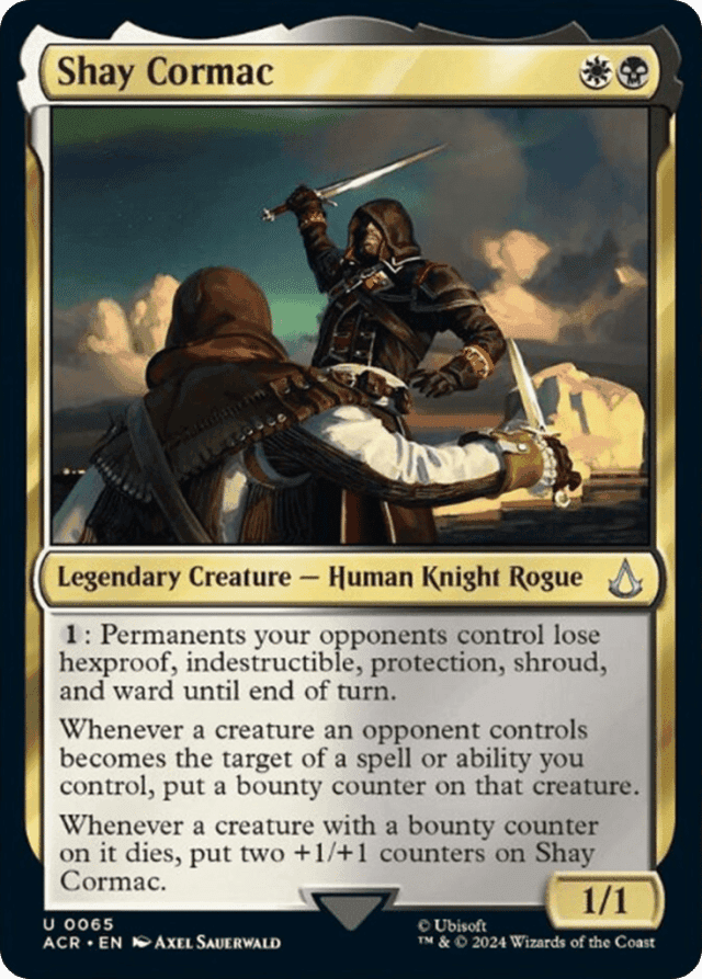{1}: Permanents your opponents control lose hexproof, indestructible, protection, shroud, and ward until end of turn. Whenever a creature an opponent controls becomes the target of a spell or ability you control, put a bounty counter on that creature. Whenever a creature with a bounty counter on it dies, put two +1/+1 counters on Shay Cormac.