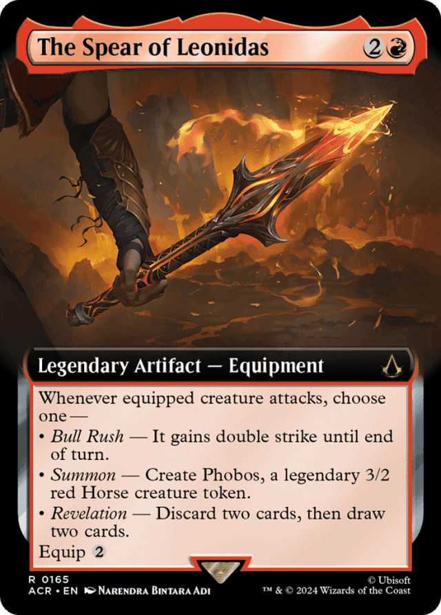 Whenever equipped creature attacks, choose one — • Bull Rush — It gains double strike until end of turn. • Summon — Create Phobos, a legendary 3/2 red Horse creature token. • Revelation — Discard two cards, then draw two cards. Equip {2}