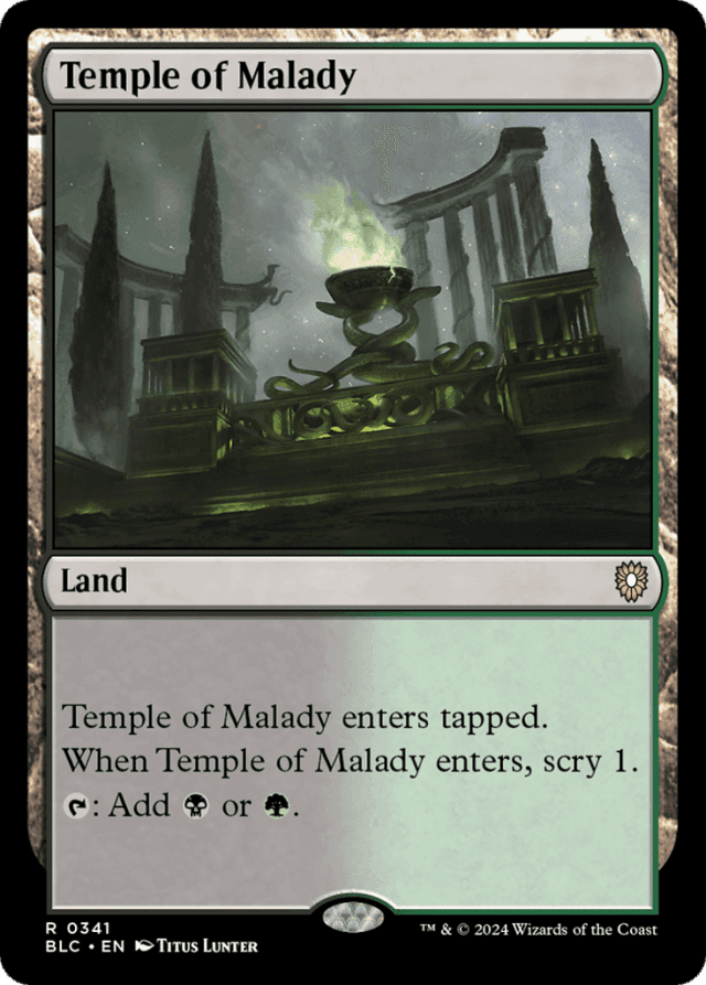 This land enters tapped. When this land enters, scry 1. (Look at the top card of your library. You may put that card on the bottom.) {T}: Add {B} or {G}.