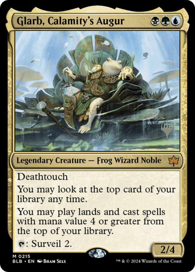 Deathtouch You may look at the top card of your library any time. You may play lands and cast spells with mana value 4 or greater from the top of your library. {T}: Surveil 2.