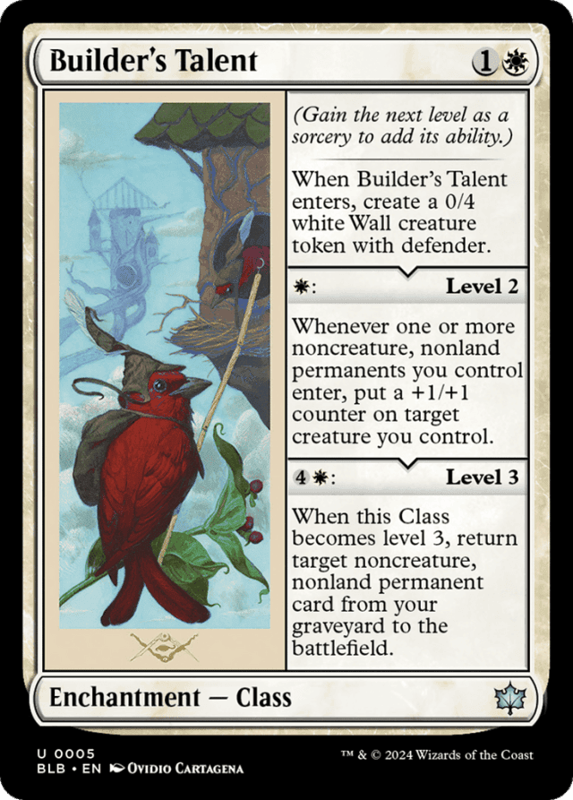 (Gain the next level as a sorcery to add its ability.) When this Class enters, create a 0/4 white Wall creature token with defender. {W}: Level 2 Whenever one or more noncreature, nonland permanents you control enter, put a +1/+1 counter on target creature you control. {4}{W}: Level 3 When this Class becomes level 3, return target noncreature, nonland permanent card from your graveyard to the battlefield.