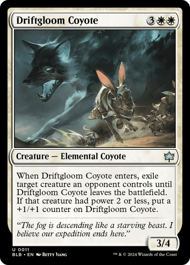 Auras attached to the exiled creature will be put into their owners’ graveyards. Any Equipment will become unattached and remain on the battlefield. Any counters on the exiled creature will cease to exist. When the card returns to the battlefield, it will be a new object with no connection to the card that was exiled. — If Driftgloom Coyote leaves the battlefield before its triggered ability resolves, the target creature won’t be exiled. — If a token is exiled this way, it will cease to exist and won’t return to the battlefield. — Use the power of the exiled creature as it last existed on the battlefield to determine whether or not to put a +1/+1 counter on Driftgloom Coyote.