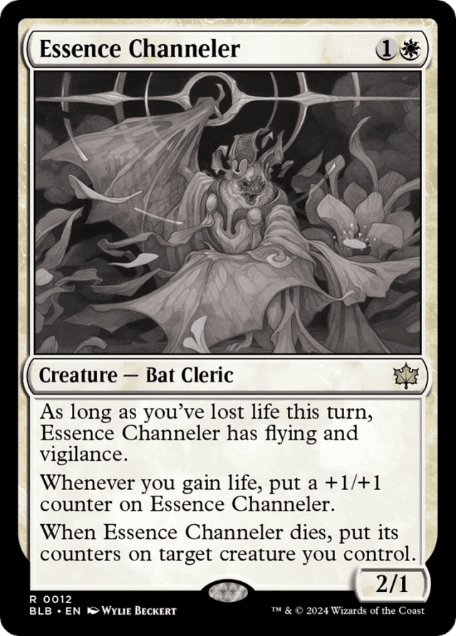 Each creature with lifelink dealing combat damage causes a separate life-gaining event. For example, if two creatures you control with lifelink deal combat damage at the same time, Essence Channeler’s second ability will trigger twice. However, if a single creature you control with lifelink deals combat damage to multiple creatures, players, planeswalkers, and/or battles at the same time (perhaps because it has trample or was blocked by more than one creature), the ability will trigger only once. — Essence Channeler’s first ability cares whether you’ve lost life this turn, not how your life total has changed. For example, if you’ve gained 2 life and lost 1 life so far this turn, you’ve still lost life. — Essence Channeler’s last ability doesn’t cause you to move counters from Essence Channeler onto the target creature. Rather, you put the same number of each kind of counter Essence Channeler had when it died onto the target creature. — Essence Channeler’s last ability puts all counters that were on Essence Channeler onto the target creature, not just its +1/+1 counters. — Essence Channeler’s second ability triggers just once for each life-gaining event, no matter how much life was gained. — If Essence Channeler has -1/-1 counters on it when it dies, that ability will include those as well. This may result in the recipient of the counters also dying. — If Essence Channeler is dealt lethal damage at the same time that you gain life, it won’t receive a counter from its second ability in time to save it. — If enough -1/-1 counters are put on Essence Channeler at the same time to make its toughness 0 or less, its last ability will see all of the +1/+1 counters it had when it died as well as the -1/-1 counters it had, and an equal number of each of those types of counters (plus any other applicable counters) will be put onto the target creature. — If you gain an amount of life “for each” of something, that life is gained as one event and Essence Channeler’s second ability triggers only once. — In a Two-Headed Giant game, life gained by your teammate won’t cause Essence Channeler’s second ability to trigger even though it caused your team’s life total to increase. — In some unusual cases, you may end up putting the appropriate counters on more than one permanent. For example, if you control The Ozolith when Essence Channeler dies, you’ll put the appropriate number of each kind of counter onto both The Ozolith and the target creature. — Once Essence Channeler has been blocked by a creature without flying or reach, losing life to give it flying and vigilance won’t cause it to become unblocked.