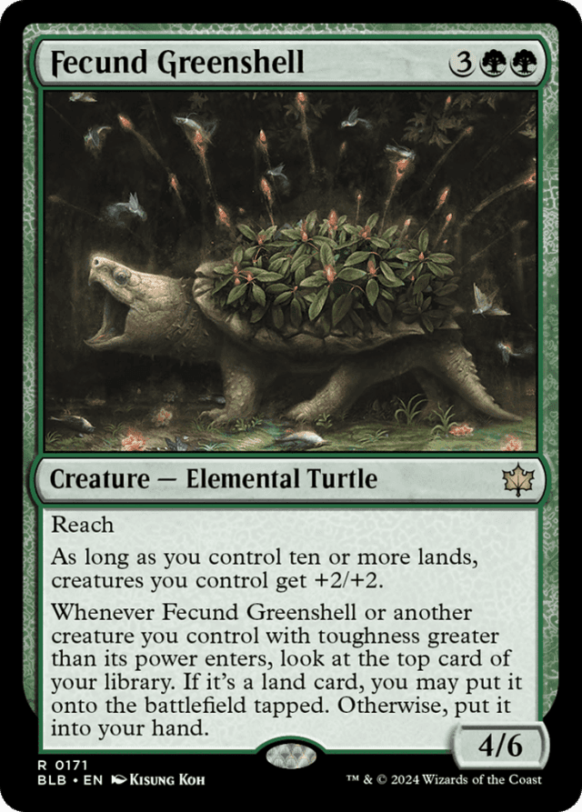 Damage remains marked on creatures until the turn ends. If Fecund Greenshell’s second ability stops applying (because Fecund Greenshell leaves the battlefield or loses its abilities or because you no longer control ten or more lands), then any creatures that needed the toughness bonus to stay alive will die. — Fecund Greenshell’s last ability checks the power and toughness of a creature only at the moment it enters. If it enters with counters, those counters are included. Static abilities that modify the power and toughness of creatures you control (such as Fecund Greenshell’s own second ability) are also included. If that creature’s toughness is greater than its power when it enters, the ability will still trigger and resolve normally regardless of what happens to that creature after that. — If the top card of your library is a land card, you may choose to put it into your hand rather than onto the battlefield tapped.