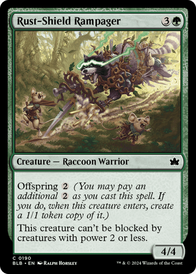 Any “enters” abilities of the copied creature will trigger when the token enters. Any “as [this creature] enters” or “[this creature] enters with” abilities of the copied creature will also work. — If the spell is countered, the offspring ability will not trigger, and no token will be created. — If the spell resolves but the creature with offspring leaves the battlefield before the offspring ability resolves, you’ll still create a token copy of it. — In the rare case where the creature doesn’t have the offspring ability when it enters, the ability won’t trigger even if you paid the offspring cost. — In the rare case where the original creature is copying something else when the offspring ability resolves, the token enters as whatever that creature copied, except it’s a 1/1. — Many creatures with offspring abilities have other abilities that refer to them as “this creature” rather than referring to them by name. This difference is for clarity purposes and does not change the function of any of these abilities. — Once Rust-Shield Rampager has been blocked, reducing the power of a blocking creature to 2 or less won’t remove that creature from combat or cause Rust-Shield Rampager to become unblocked. — The token copies exactly what was printed on the original creature and nothing else, except it’s a 1/1 (unless that creature is copying something else; see below). It doesn’t copy whether that creature is tapped or untapped, whether it has any counters on it or Auras and Equipment attached to it, or any non-copy effects that have changed its types, color, or so on. — The token created by the offspring ability isn’t “cast”, so abilities that trigger when a creature spell is cast won’t trigger for the copy. — You can pay an offspring cost only once as you cast a spell with offspring. You can’t try to pay it multiple times to get more token copies.