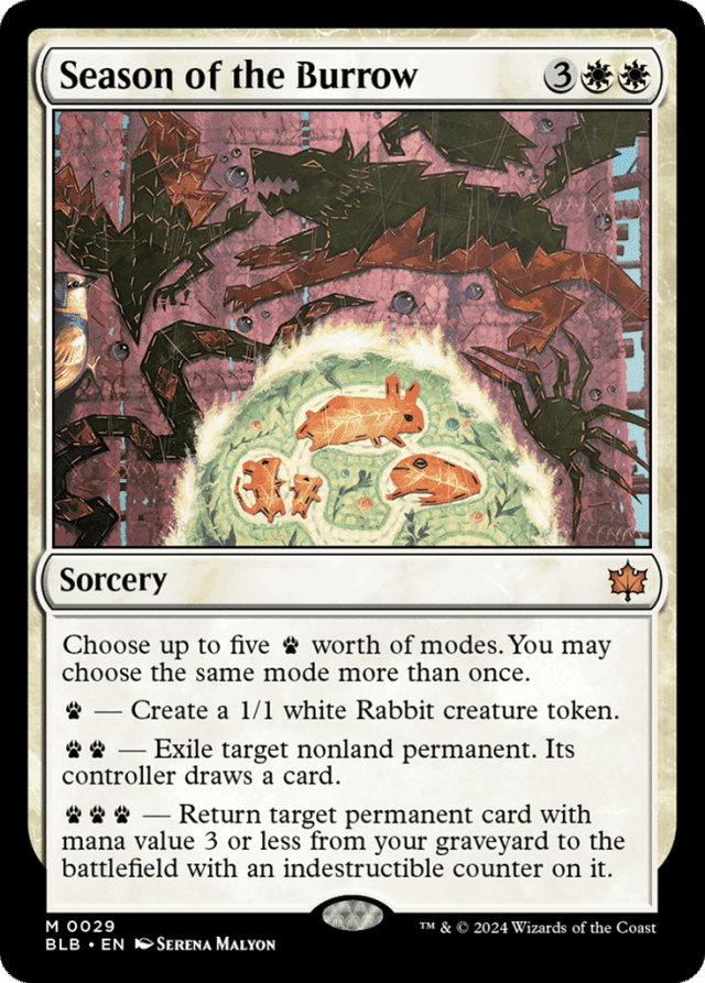 Choose up to five {P} worth of modes. You may choose the same mode more than once. {P} — Create a 1/1 white Rabbit creature token. {P}{P} — Exile target nonland permanent. Its controller draws a card. {P}{P}{P} — Return target permanent card with mana value 3 or less from your graveyard to the battlefield with an indestructible counter on it.