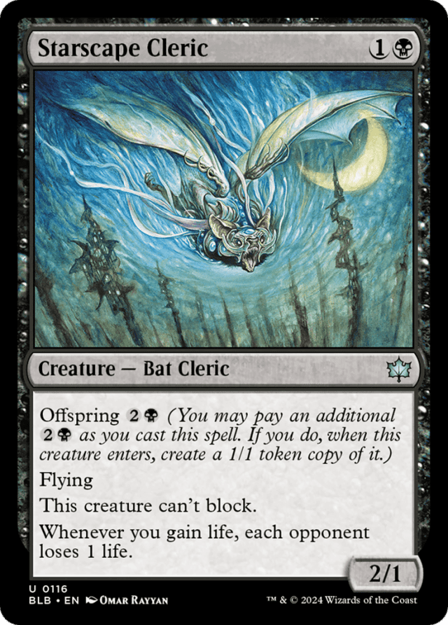 Any “enters” abilities of the copied creature will trigger when the token enters. Any “as [this creature] enters” or “[this creature] enters with” abilities of the copied creature will also work. — If multiple creatures with lifelink you control deal combat damage at the same time, the damage dealt by each of those creatures is a separate life-gaining event and Starscape Cleric’s ability will trigger that many times. — If the spell is countered, the offspring ability will not trigger, and no token will be created. — If the spell resolves but the creature with offspring leaves the battlefield before the offspring ability resolves, you’ll still create a token copy of it. — In the rare case where the creature doesn’t have the offspring ability when it enters, the ability won’t trigger even if you paid the offspring cost. — In the rare case where the original creature is copying something else when the offspring ability resolves, the token enters as whatever that creature copied, except it’s a 1/1. — Many creatures with offspring abilities have other abilities that refer to them as “this creature” rather than referring to them by name. This difference is for clarity purposes and does not change the function of any of these abilities. — The token copies exactly what was printed on the original creature and nothing else, except it’s a 1/1 (unless that creature is copying something else; see below). It doesn’t copy whether that creature is tapped or untapped, whether it has any counters on it or Auras and Equipment attached to it, or any non-copy effects that have changed its types, color, or so on. — The token created by the offspring ability isn’t “cast”, so abilities that trigger when a creature spell is cast won’t trigger for the copy. — You can pay an offspring cost only once as you cast a spell with offspring. You can’t try to pay it multiple times to get more token copies.