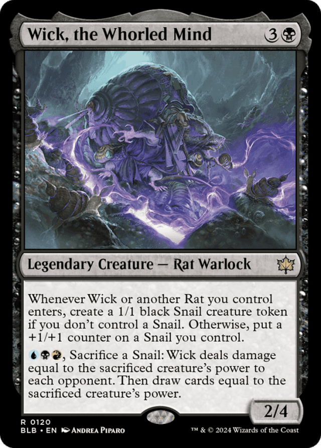 Whenever Wick or another Rat you control enters, create a 1/1 black Snail creature token if you don't control a Snail. Otherwise, put a +1/+1 counter on a Snail you control. {U}{B}{R}, Sacrifice a Snail: Wick deals damage equal to the sacrificed creature's power to each opponent. Then draw cards equal to the sacrificed creature's power.