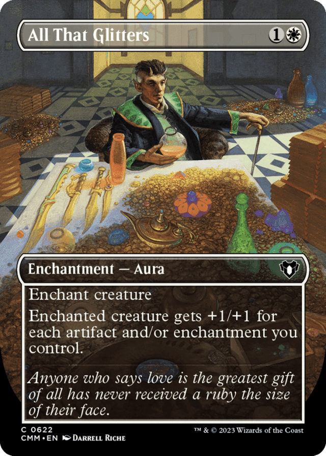 A permanent that's both an artifact and an enchantment is counted only once. — Because All That Glitters is an enchantment, the enchanted creature usually gets at least +1/+1. — You still control Auras that you put onto the battlefield attached to a permanent you don't control.