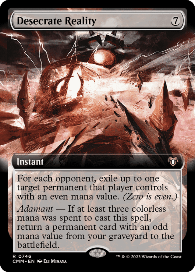 For each opponent, exile up to one target permanent that player controls with an even mana value. (Zero is even.) Adamant — If at least three colorless mana was spent to cast this spell, return a permanent card with an odd mana value from your graveyard to the battlefield.