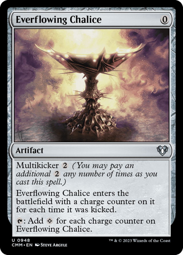 You can cast Everflowing Chalice without kicking it at all if you wish. However, if Everflowing Chalice has no charge counters on it, activating its last ability won't produce any mana. — If a card or token enters as a copy of a permanent, the new permanent isn't kicked, even if the original was. — If a spell's kicker cost was paid, the spell is "kicked." — If you copy a kicked spell on the stack, the copy is also kicked. If the copied spell is a permanent spell, the token the copy of that spell becomes when it enters is also kicked. — If you put a permanent with a kicker ability onto the battlefield without casting it, you can't kick it. — The kicker ability doesn't let you pay a kicker cost more than once. — To determine a spell's total cost, start with the mana cost (or an alternative cost if another card's effect allows you to pay one instead), add any cost increases (such as kicker), then apply any cost reductions. The spell's mana value remains unchanged, no matter what the total cost to cast it was.