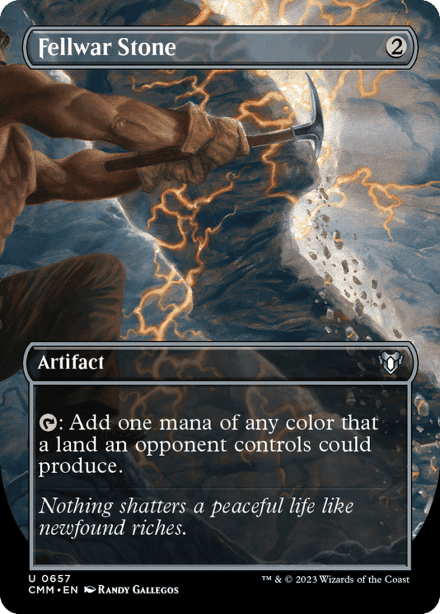 It only produces one mana even if the land can produce more than one. — The ability can be activated if the opponent has no lands that produce mana, but the effect will not be able to generate any mana. — This works even if the opponent's lands are tapped. It only checks what kinds of mana can be produced, not if the abilities that produce them are usable right now. — Fellwar Stone checks the effects of all mana-producing abilities of lands your opponents control, but it doesn't check their costs. For example, Vivid Crag has the ability "{T}, Remove a charge counter from Vivid Crag: Add one mana of any color." If an opponent controls Vivid Crag and you control Fellwar Stone, you can tap Fellwar Stone for any color of mana. It doesn't matter whether Vivid Crag has a charge counter on it, and it doesn't matter whether it's untapped. — Fellwar Stone doesn't care about any restrictions or riders your opponents' lands (such as Ancient Ziggurat or Hall of the Bandit Lord) put on the mana they produce. It just cares about colors of mana. — The colors of mana are white, blue, black, red, and green. Fellwar Stone can't be tapped for colorless mana, even if a land an opponent controls could produce colorless mana. — When determining what colors of mana your opponents' lands could produce, take into account any applicable replacement effects that would apply to those lands' mana abilities (such as Contamination's effect, for example). If there is more than one, consider them in any possible order.