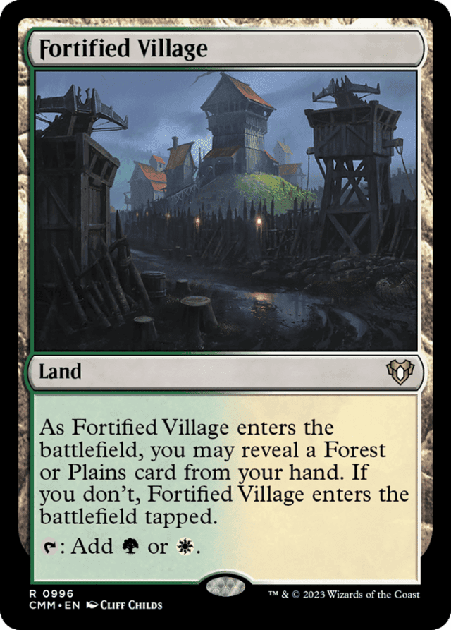 If a Forest or Plains is entering the battlefield from your hand at the same time as Fortified Village, you may reveal the other land to have Fortified Village enter untapped. — If an effect instructs you to put Fortified Village onto the battlefield tapped, it will still enter the battlefield tapped even if you reveal a land card from your hand. — Lands don't have a subtype just because they can produce mana of the corresponding color. Fortified Village itself is neither a Forest nor a Plains, even though it produces green and white mana, so you can't reveal one to satisfy the ability of another. — You may reveal any land card with either or both of the appropriate subtypes. It doesn't have to be a basic land. For example, you could reveal Prairie Stream from the Battle for Zendikar set to satisfy the ability of Fortified Village.
