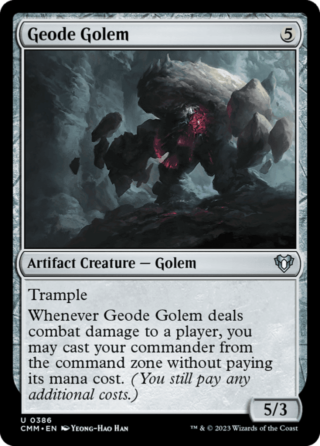 Geode Golem's triggered ability triggers even if it's dealt lethal damage at the same time it deals combat damage to a player. — Geode Golem's triggered ability triggers even if your commander isn't in the command zone at the time Geode Golem deals combat damage to a player. If your commander finds its way there before the trigger resolves, you can cast it. — If a spell has {X} in its mana cost, you must choose 0 as the value of X when casting it without paying its mana cost. — If you cast a card “without paying its mana cost,” you can't choose to cast it for any alternative costs, such as bestow costs. You can, however, pay additional costs. If the card has any mandatory additional costs, such as the commander tax, those must be paid to cast the card. — If you wish to cast your commander without paying its mana cost, you must cast it while the triggered ability of Geode Golem is resolving. You can't cast for free it later in the turn. It may be cast at a time you normally wouldn't be able to cast a creature spell, but other restrictions (such as “Cast this card only from your graveyard”) are enforced.