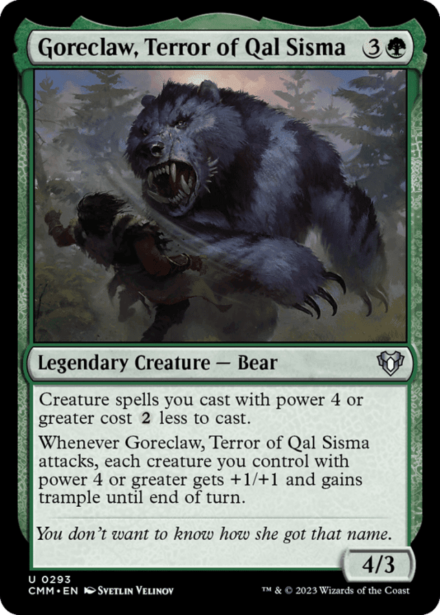 Creature spells you cast with power 4 or greater cost {2} less to cast. Whenever Goreclaw attacks, each creature you control with power 4 or greater gets +1/+1 and gains trample until end of turn.