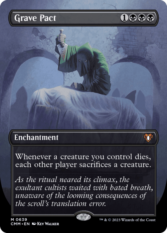 If multiple creatures you control die at the same time, Grave Pact's ability will trigger that many times. — If two players each control a Grave Pact and a creature controlled by one of those players dies, a chain reaction happens. First the ability of that player's Grave Pact will trigger, causing each other player to sacrifice a creature. That sacrifice causes the ability of the other player's Grave Pact to trigger, and so on. — If you control more than one Grave Pact and a creature you control dies, each of the triggered abilities will trigger. Each other player will sacrifice a creature each time one of those abilities resolves. — In a Two-Headed Giant game, when a creature you control dies, Grave Pact's triggered ability will cause each other player, including your teammate, to sacrifice a creature. Grave Pact's ability won't trigger when a creature your teammate controls dies. — None of the players are targeted. A player with hexproof would still sacrifice a creature. — When the triggered ability resolves, first the player whose turn it is (if it isn't your turn) chooses which creature they will sacrifice, then each other player in turn order does the same, then all chosen creatures are sacrificed at the same time.