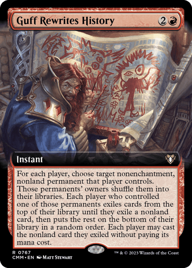 For each player, choose target nonenchantment, nonland permanent that player controls. Those permanents' owners shuffle them into their libraries. Each player who controlled one of those permanents exiles cards from the top of their library until they exile a nonland card, then puts the rest on the bottom of their library in a random order. Each player may cast the nonland card they exiled without paying its mana cost.