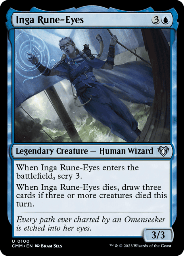 When Inga Rune-Eyes enters, scry 3. When Inga Rune-Eyes dies, draw three cards if three or more creatures died this turn.