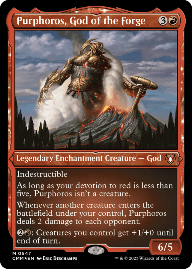 Indestructible As long as your devotion to red is less than five, Purphoros isn't a creature. Whenever another creature you control enters, Purphoros deals 2 damage to each opponent. {2}{R}: Creatures you control get +1/+0 until end of turn.