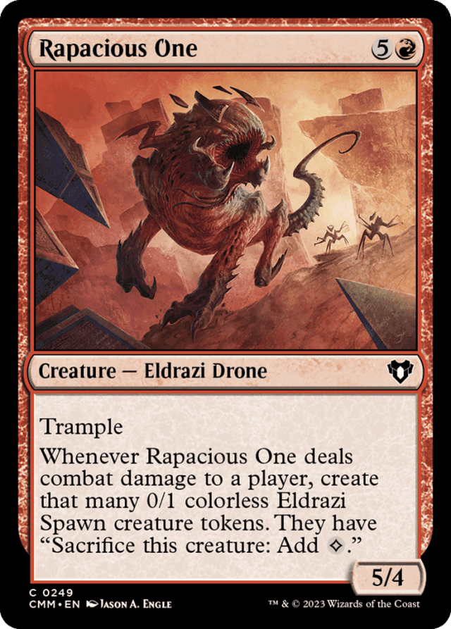 Trample Whenever this creature deals combat damage to a player, create that many 0/1 colorless Eldrazi Spawn creature tokens. They have "Sacrifice this token: Add {C}."