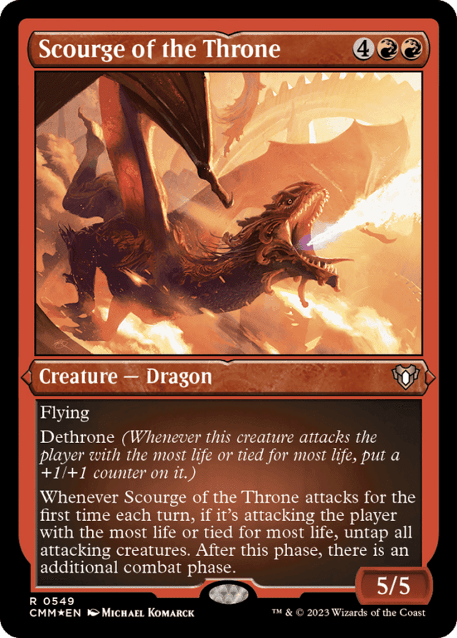 Flying Dethrone (Whenever this creature attacks the player with the most life or tied for most life, put a +1/+1 counter on it.) Whenever this creature attacks for the first time each turn, if it's attacking the player with the most life or tied for most life, untap all attacking creatures. After this phase, there is an additional combat phase.