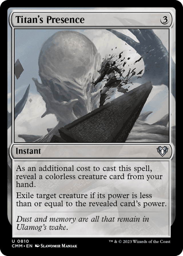 Check the target creature’s power as Titan’s Presence resolves to see if it’s less than or equal to revealed creature card’s power. If it’s greater, Titan’s Presence will finish resolving with no effect. — The colorless creature card stays revealed until Titan’s Presence leaves the stack. — The colorless creature card you reveal doesn’t have to still be in your hand as Titan’s Presence resolves. If it’s not, use its power as it last existed in your hand.