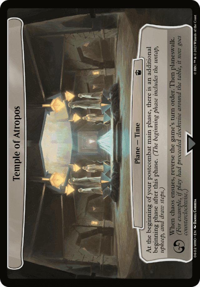 After the additional beginning phase, the game proceeds to the ending phase (unless something has added even more phases; see below). — Even if you don't attack with any creatures during combat, you'll still get a postcombat main phase and Temple of Atropos's ability will still trigger. — If multiple phases are added to the same point in your turn, the most recently created phase happens first. For example, say the current plane is Temple of Atropos and its ability triggers during your postcombat main phase. Later during that same main phase, another effect gives you an additional combat phase after this main phase. The additional combat will happen first, followed by the additional beginning phase. — If the game's turn order is reversed again, it will return to the default order used at the beginning of the game. — If the turn order is reversed during a two-player game, or during a multiplayer game that only has two players left, it has no noticeable effect on the game. — If the turn order is reversed during an extra turn, the next non-extra turn will be taken by the next player in turn order from the last player who took a non-extra turn. The order of any pending extra turns isn't affected. — If you somehow have more than two main phases in a turn, each main phase other than the first one is a postcombat main phase, and Temple of Atropos's ability triggers at the beginning of each of them. — Reversing the turn order has no effect on the order of steps and phases in each turn. Those steps and phases still happen normally (along with the additional beginning phase). — The additional beginning phase all happens during the current turn. Any effects that last "until your next turn" or similar won't expire just because you'll go through an additional beginning phase. — The additional beginning phase will be a lot like your normal beginning phase. During the untap step, permanents will phase in or out as appropriate and you'll untap your tapped permanents. Anything that triggers "at the beginning of your upkeep" or similar will trigger during the upkeep step, and you'll eventually draw a card for your draw step. — The effect of the chaos ability reverses the turn order for players established at the beginning of the game. While the order is reversed, anything that cares about this order (such as determining in what order choices are made) will use the new order.