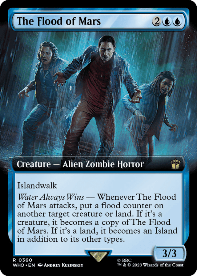 Islandwalk (This creature can't be blocked as long as defending player controls an Island.) Water Always Wins — Whenever this creature attacks, put a flood counter on another target creature or land. If it's a creature, it becomes a copy of this creature. If it's a land, it becomes an Island in addition to its other types.